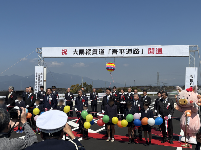 令和8年3月20日15:00に地域高規格道路大隅縦貫道 吾平道路 が開通しました。開通前に催された開通式典には当社鹿児島支店長他が出席しました。大隅縦貫道路は鹿屋市串良町から錦江町を経由し、肝属郡大隅町に至る約50kmの地域高規格道路です。このたびの吾平道路4.2kmの開通により、旧吾平市街地までの区間が整備され、大隅半島南部における畜産拠点や観光スポットへのアクセスが向上しました。当社は当該路線の事業認定に係る環境影響評価業務を担当しました。